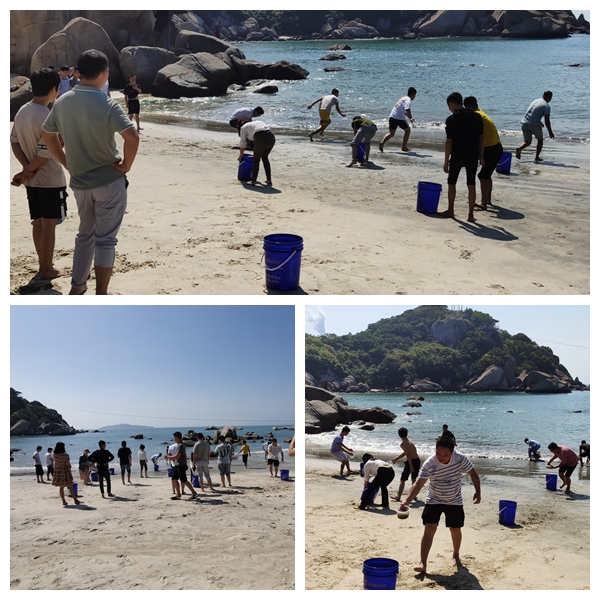 25日早上 8:00,我们准时出发啦!然后以抽签的方式,将整个团队分为三个小队,其中每个小队包含队长一名,副队长两名,剩下的为队员,各自拿到自己的身份后,队长确认本队人员。讲解活动比赛规则,三个小队每个活动比赛都有现金红包,红包金额大小没有统一,全凭抽奖者运气,只分红包数量,第一名抽三个红包,第二名抽两个红包,第三名抽一个红包,活动结束后,每队的金额多少决定了最后一餐的丰盛程度。并在车上讲解公司的执行力,要求这次活动必须要有超强的执行力。后面接着就是大家的红包接力,不知不觉中很快就到了,10点30分到达海岸边,由于时间比较早,首先是在海岸边下车,各队队长集合本队队员,大家一起合照,并喊出自己的口号。