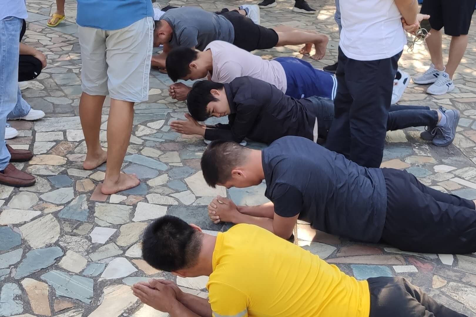 下午15点整,临时增加的平板支撑活动,三个小队同时比赛,每个小队派出两名队员,比赛开始后如果有任何一队其中一个人坚持不了倒地就算失败,从而根据时间长短产生出一二三名。