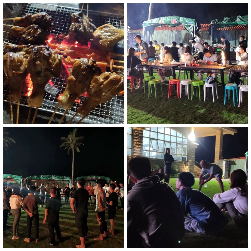18点30分集体烧烤,大家围成一圈喊出汇高愿景:“制造让客户赚钱的机床、让优秀的员工过上优质的生活!中途还玩了一个无声游戏:三个小队排好队形,不能发出声音去表演节目,让所有人去猜猜是什么,每队人员交错表演,表演动作不能重复,没有猜对的队扣5分。发挥大脑想象力,创造力。