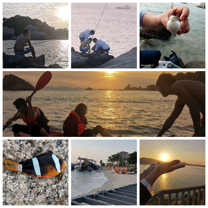16点捕鱼活动及潜水活动,三个小组经过队长安排,每队分出三人,提前准备晚上烧烤食材。其余人员开始捕鱼活动,捕鱼规则是鱼多者胜出。在捕鱼的同时,有的可以拍风景、游泳、潜泳、皮划艇等多个活动项目。
